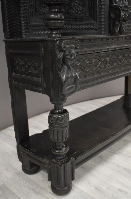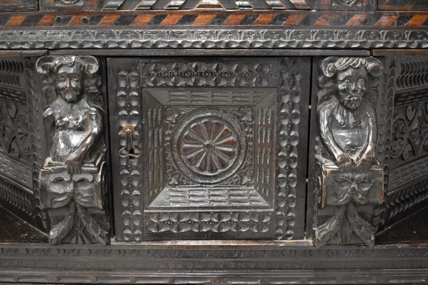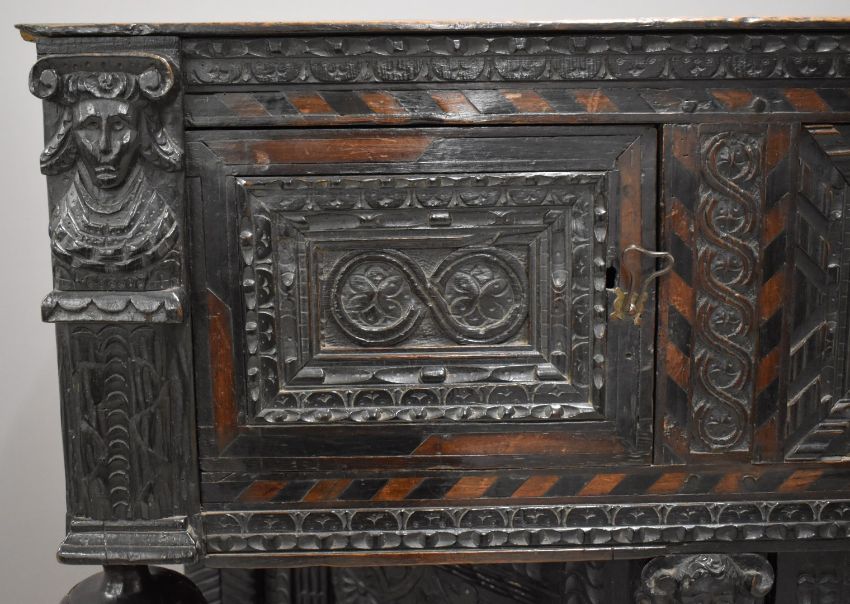 Elizabeth I / Tudor jointed oak and parquetry inlaid figurally decorated canted court cupboard, the single plank top raised above two cupboards and blind central panel decorated with figure of eight foliate decoration, stepped borders, scrolling panels, inlaid bog oak and holly surround flanked by male and female high status figures, probably king and queen, the king's image repeat carved lower down the piece. The central cupboard and panels decorated with foliate roundels, stepped adzed borders, two male and female figures, and bulbous carved supports, the lower part of the cupboard with two carved straight drawers flanked by the aforementioned figures raised above a simple plank shelf, fluted supports and bun feet, W129 x D39 x H139cm