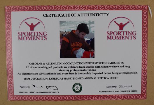 Cesc Fabregas signed Arsenal football shirt, framed and glazed with certificate of authenticity.