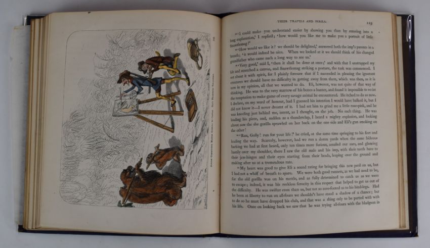The Hatchet Throwers [The Adventures of Three Ancient Mariners & The Brass Brothers of Bristol] by James Greenwood with 36 illustrations drawn on wood by Ernest Griset from his Original Designs published John Camden Hotten 1866 first edition with hand-coloured illustrations throughout in gilt illustrated cloth with lettered spine