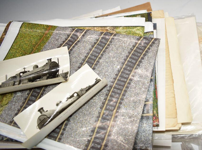 A collection of 00 gauge rolling stock comprising six coaches, eight goods wagons and a locomotive, track, model railway plans, weathering book, 0 gauge signal box kit etc