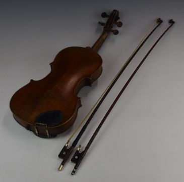 Antonio Stradivarius copy violin, with label bearing date 1690, having two piece 36cm back, overall length 60cm, in case with two bows