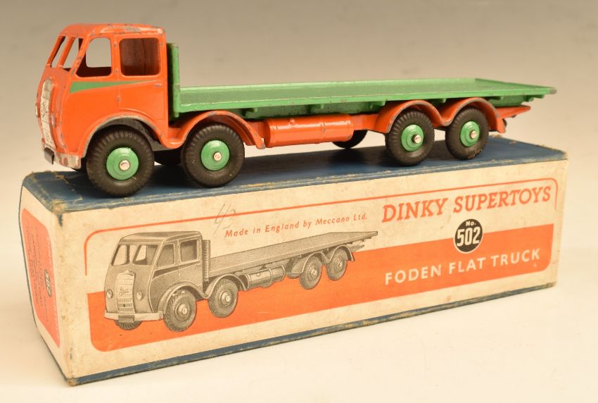 Dinky Supertoys diecast model Foden Flat Truck with orange cab and green bed and hubs, 502, in original box.