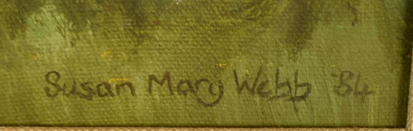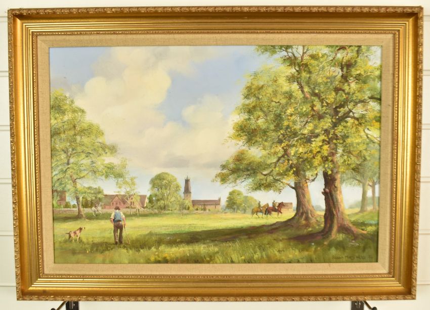 Susan Mary Webb (Irish, b1962) oil on canvas horse riders and figures with church beyond, signed and dated ‘84 lower right, 39 x 59cm, in gilt frame