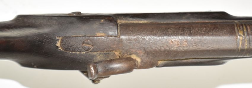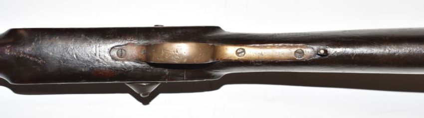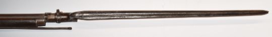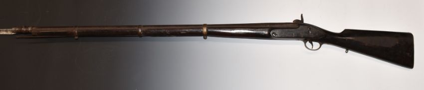 Enfield pattern 3-band percussion hammer action rifle with line engraved lock and hammer, chequered grip, sling mounts, 39.5 inch smooth bored barrel and associated bayonet, overall length excluding bayonet 140cm.