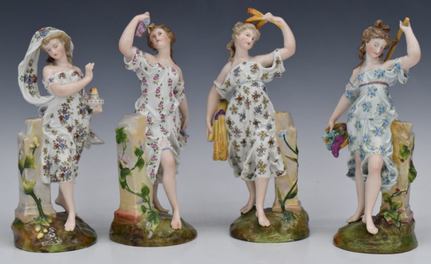 Four 19th/20thC porcelain figurines of the Four Seasons with Chelsea/Derby style gold anchor marks to bases, H28cm