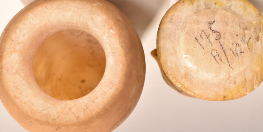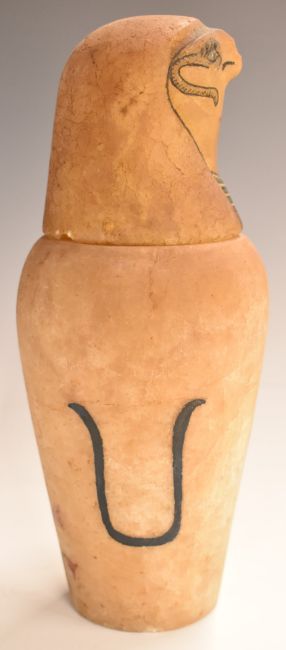 Egyptian style canopic jar in the form of a falcon made from alabaster with later painted decoration, 25cm tall.