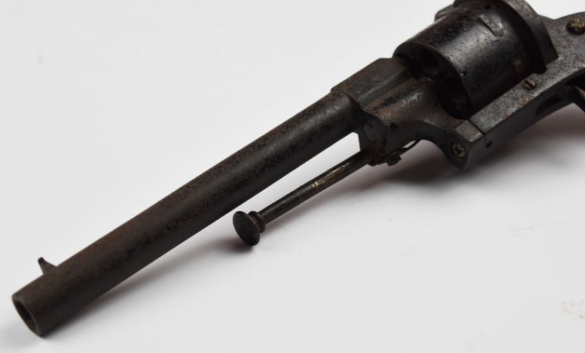 Unnamed 9mm six-shot double action pinfire revolver with shaped wooden grips and 5.75 inch rifled barrel, overall length 28.cm.