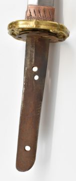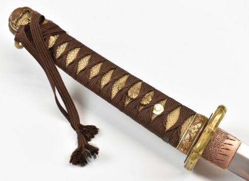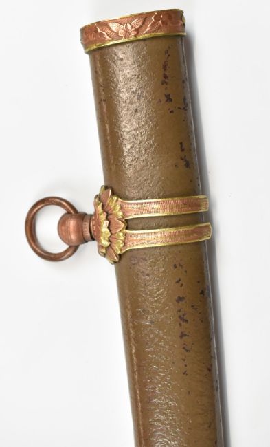 Japanese Katana Samurai sword with hammered and embossed copper kashira with applied silver family mon, shagreen handle, embossed gilt tsuba, hammed and gilt copper fuchi, floral gilt menuki and 70cm blade, in metal scabbard with gilt hammered copper fittings, overall length 104cm. PLEASE NOTE ALL BLADED ITEMS ARE SUBJECT TO OVER 18 CHECK ON COLLECTION OR DELIVERY