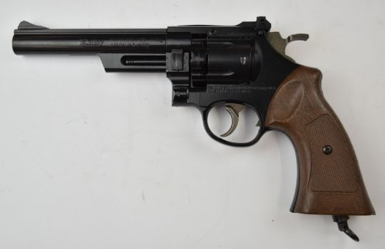 Daisy Power Line Model 44 CO2 air pistol/ revolver with composite grips and six shot magazine, serial number 0695 10469, in fitted box with six additional magazines.
