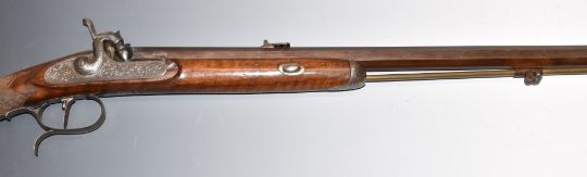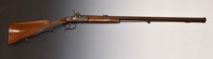 Belgian percussion hammer action rifle with floral engraving to the lock, hammer, double spurred trigger guard butt plate, mounts and top plate, pop-up sights, adjustable trigger, brass ram-rod, chequered grip, sling mounts and 29 inch octagonal barrel, overall length 114.5cm.