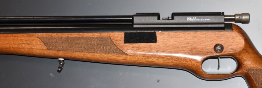 Brocock Hunter .22 PCP air rifle with chequered semi-pistol grip, raised cheek piece, adjustable trigger, sound moderator and sling mounts, serial number 00800.