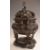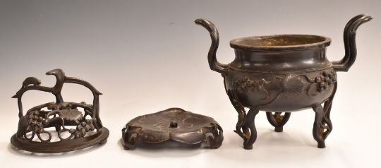 Chinese covered twin handled censer with under tray/ stand, grape and vine decoration and handle with animal finial, 33cm in diameter.