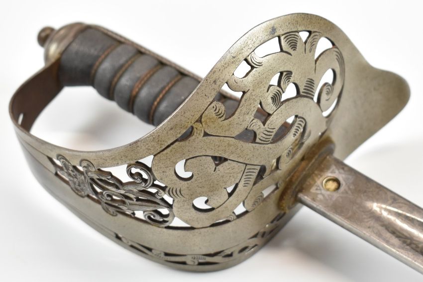 1895 pattern Infantry Officer's sword by Thirkle with VR cypher to guard, shagreen grip and coat of arms to 84cm part decorated blade. PLEASE NOTE ALL BLADED ITEMS ARE SUBJECT TO OVER 18 CHECK ON COLLECTION OR DELIVERY