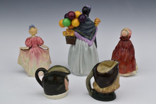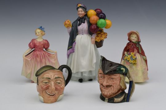 Royal Doulton figurines and character jugs including Biddy Penny Farthing, Sweeting, Granny's Shawl etc, tallest 22cm