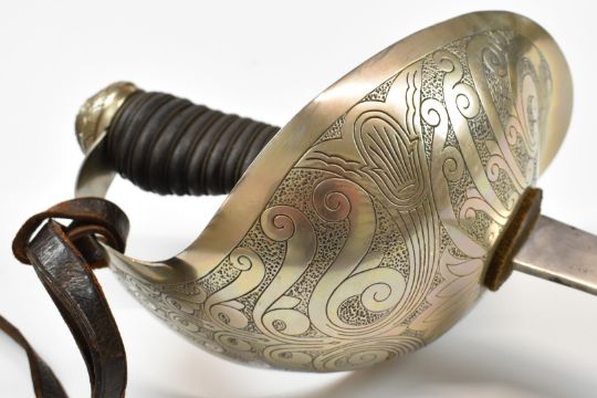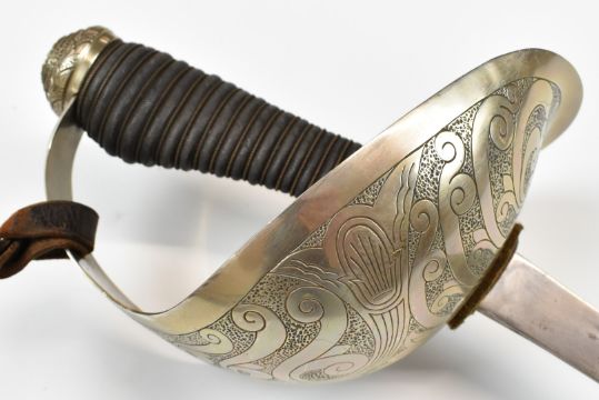 British 1912 pattern Cavalry Officer's sword with bowl, guard 89cm decorated fullered blade, GR cypher complete with sword knot and leather scabbard. PLEASE NOTE ALL BLADED ITEMS ARE SUBJECT TO OVER 18 CHECK ON COLLECTION OR DELIVERY