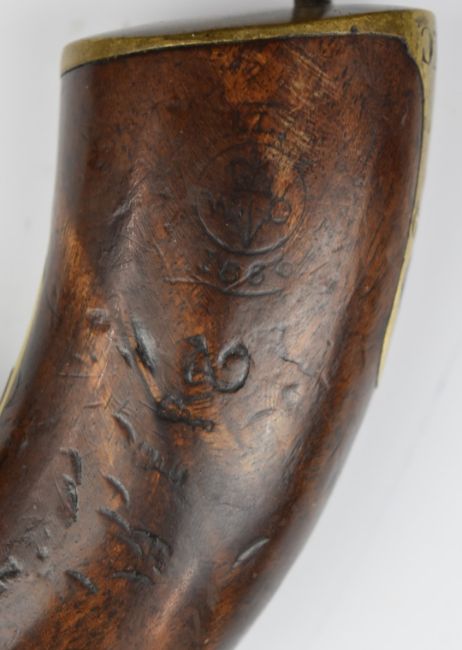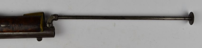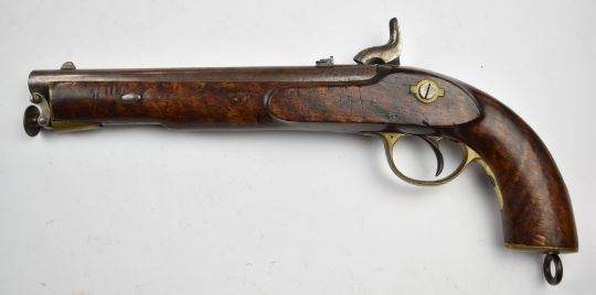 Percussion hammer action pistol with five groove rifling, lock stamped '1857 Tower' and with crown over VR cypher, brass butt plate stamped to the strap '1869 D 3 ECYC', captive ram-rod, brass trigger guard and mounts, belt loop, pop-up alignment sights, stock stamped with 'WO 1866' mark and other indistinct markings and 9.5 inch rifled barrel, overall length 42cm