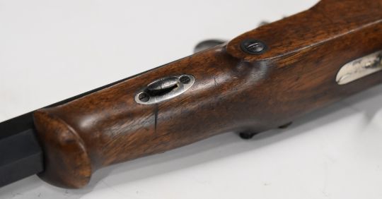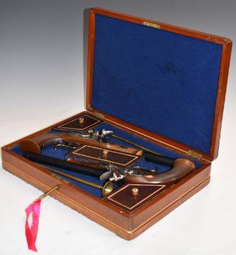 A pair of Armi Sport William Parker .45 flintlock dueling pistols with engraved locks marked 'London', chequered grips, spurred trigger guards, set triggers and 9.5 inch octagonal barrels engraved 'W.Parker', overall length 41cm, serial numbers P40648 and P40659, in fitted mahogany case with brass ram-rods and accessories. PLEASE NOTE THAT A VALID RELEVANT FIREARMS/SHOTGUN CERTIFICATE IS REQUIRED TO HANDLE/PURCHASE THIS ITEM.
