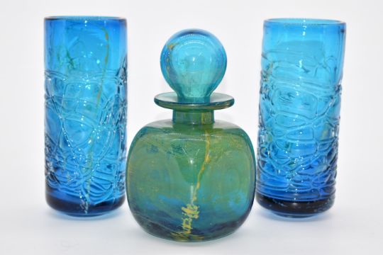 Mdina bottle with stopper and a pair of and trailed vases, tallest 20cm