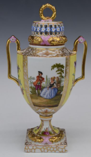 Dresden porcelain twin handled covered pedestal pot pourri decorated with Watteau scenes, H25cm