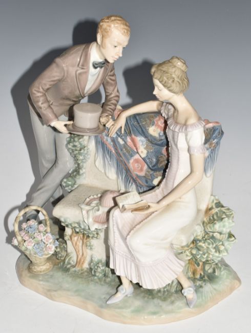 Lladro figural group Will You Marry Me? sweethearts on a garden seat, with original box, H31cm