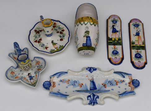 A collection of Quimper faience ware including chamber sticks, one Henriot, pen stand, clog etc, tallest 9.5cm