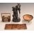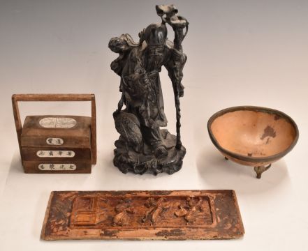 Chinese carved wooden plaque or panel with figural decoration together with a carved figure of an elder (29.5cm tall) and an ethnic bowl with figural animal supports and a sectional wooden carrier.