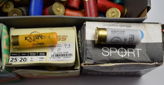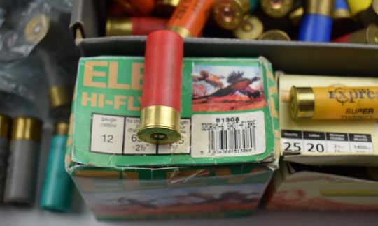 Over 150 .410, 12 and 20 bore shotgun cartridges including Eley Maximum, Tunet, Eley Grand-Prix, Lyalvale Express, Eley High-Bird, etc som ein original boxes. PLEASE NOTE THAT A VALID RELEVANT FIREARMS/SHOTGUN CERTIFICATE IS REQUIRED TO HANDLE/PURCHASE THIS ITEM. Please note we are not able to post this lot.