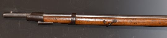 D A Page French trapdoor breech loading percussion converted from flintlock rifle with sling mounts, raised cheek piece to the stock, lock stamped '855, steel butt plate stamped '8. L St 596' adjustable pop-up sights and 36.75 inch smooth bored barrel, overall length 133cm.