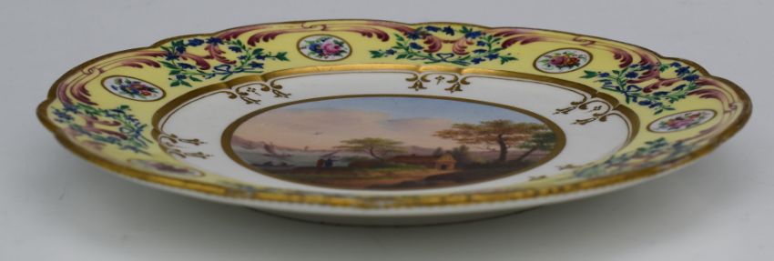 Continental relief moulded cabinet plate with sailing boats and figural decoration and Sevres mark verso, diameter 25cm