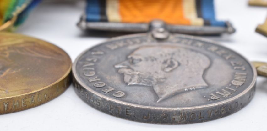 British Army WW1 medal pair comprising War Medal and Victory Medal named to 23056 Pte J R Holyhead, Army Veterinary Corps together with a small collection of shoulder titles including East Lancashire Regiment, Notts & Derby Regiment etc