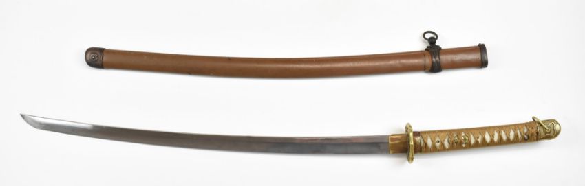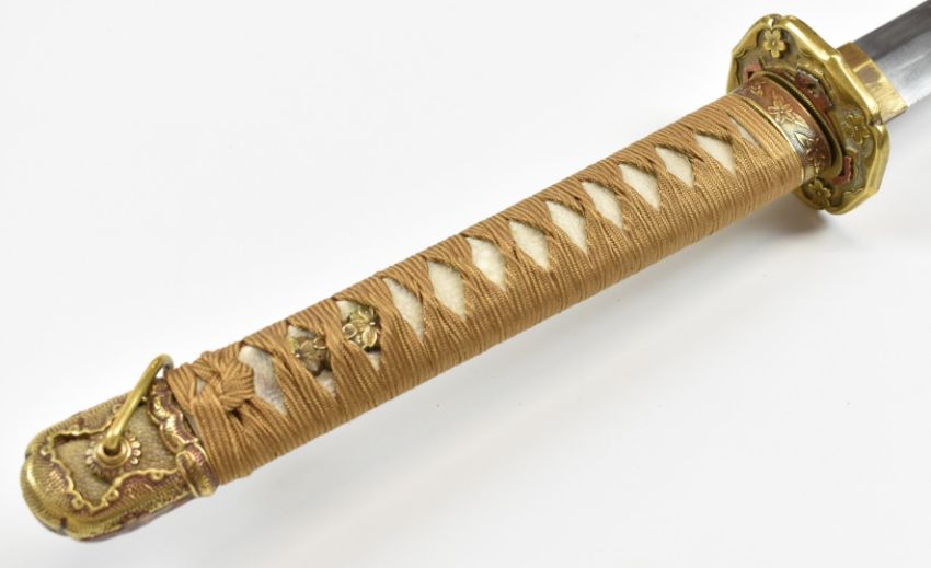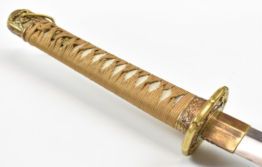 Japanese Katana Samurai sword with signed and dated blade, hammered and embossed kashira, shagreen handle, embossed brass tsuba, hammed and gilt copper fuchi, floral gilt menuki and 69cm blade, in metal scabbard with hammered copper fittings, overall length 95cm. PLEASE NOTE ALL BLADED ITEMS ARE SUBJECT TO OVER 18 CHECK ON COLLECTION OR DELIVERY