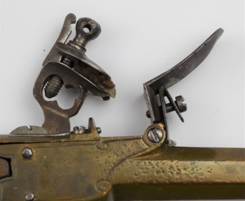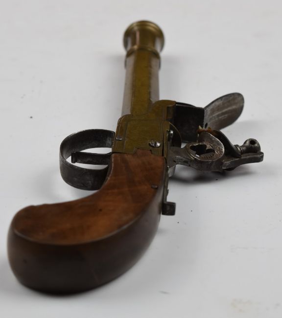 Flintlock pistol with line engraved brass lock, thumb slide safety, walnut grip and 5 inch smooth bored brass cannon barrel, overall length 24.5cm