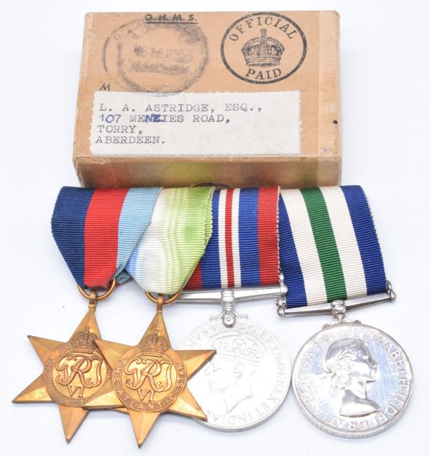 WW2 medals comprising 1939-1945 Star, Atlantic Star and Elizabeth II Long Service Good Conduct Medal named to W999536 L A Astridge RO2, RNR, together with postal box