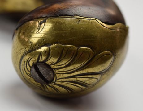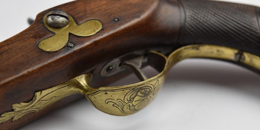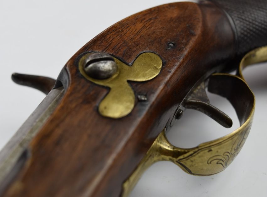 Unnamed percussion converted from flintlock hammer action coat pistol with engraved brass trigger guard and mounts, chequered grip, brass tipped wooden ram-rod and 5 inch smooth bored part-octagonal barrel, overall length 27.cm