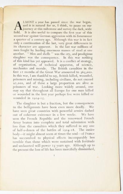 'Never In The Field of Human Conflict' speech by Winston Churchill in the House of Commons, August 20th 1940, printed booklet on watermarked paper
