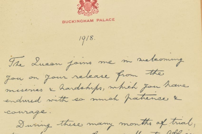 WW1 Royal Marine Light Infantry medal pair comprising War Medal and Victory Medal named to CH198 Pete F W Jobbins, RMLI, with his Imperial Service medal (Francis William), Prisoner of War Buckingham Palace letter, portrait, silver Royal Marine Light Infantry badge and group photograph dated 1917