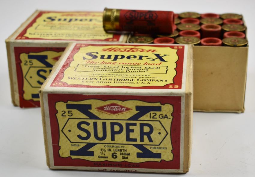 Fifty Western Cartrige Company of East Alton Illinois USA Super-X The Long Range Load 12 bore shotgun cartridges, in two original boxes. PLEASE NOTE THAT A VALID RELEVANT FIREARMS/SHOTGUN CERTIFICATE IS REQUIRED TO HANDLE/PURCHASE THIS ITEM. Please note we are not able to post this lot.