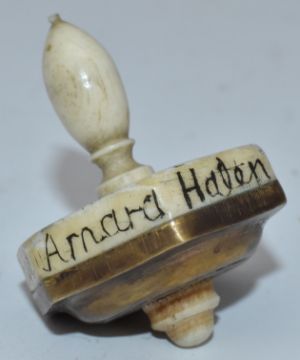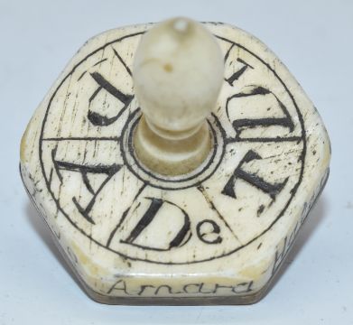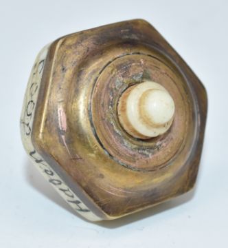 WW1 bone and brass teetotum spinning game, six sided polygon design with letters to the top and early WW1 battles to the edges