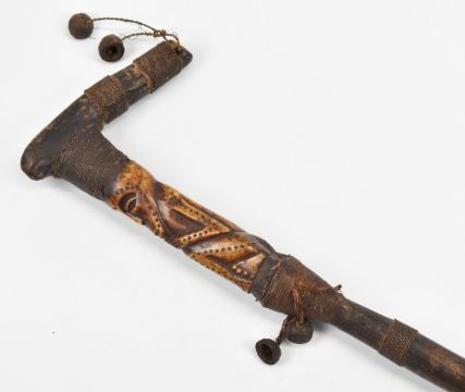 Tribal wire bound and bone handled carved wooden walking or king stick, 85cm long.