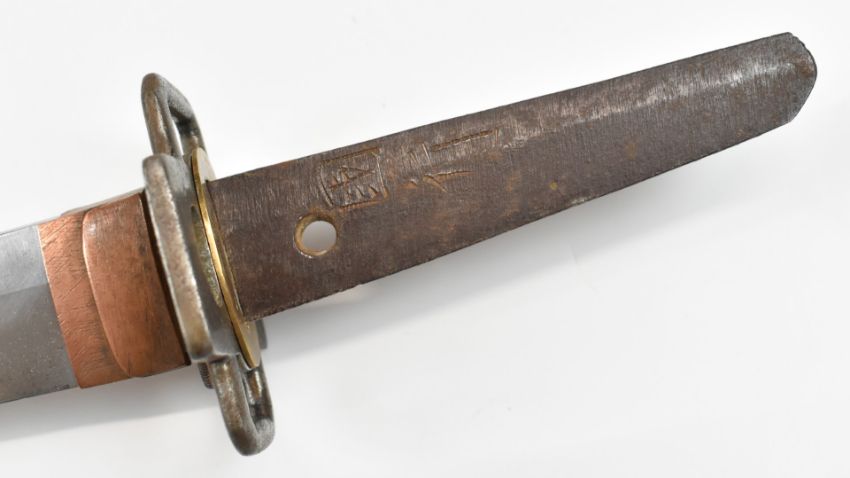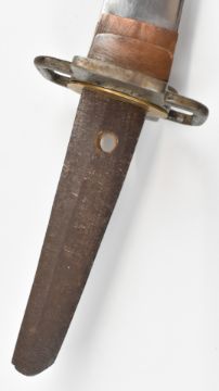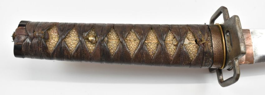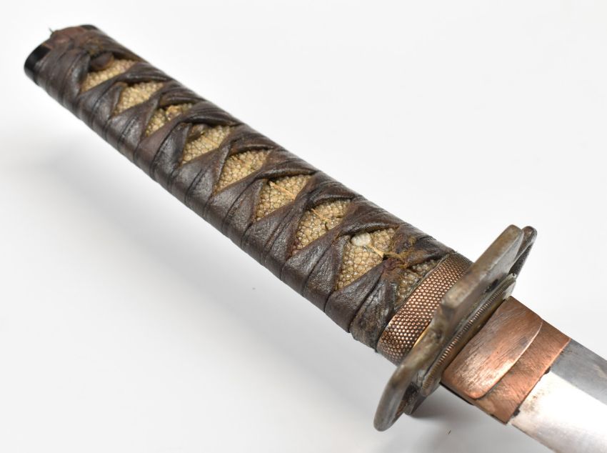 Japanese Wakizashi Samurai sword with signed tang, hammered and embossed copper fuchi, shagreen handle, pierced steel tsuba, floral gilt and embossed brass menuki, embossed copper kozuka and 46cm blade, in lacquer scabbard, overall length 63.5cm. PLEASE NOTE ALL BLADED ITEMS ARE SUBJECT TO OVER 18 CHECK ON COLLECTION OR DELIVERY