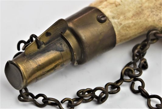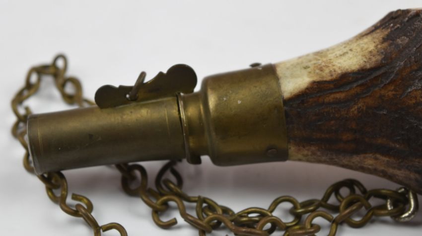 Two unusual horn or antler double powder and shot flasks both with brass fittings, one inscribed '8.5.24' and '30.3.43', largest 21cm long.