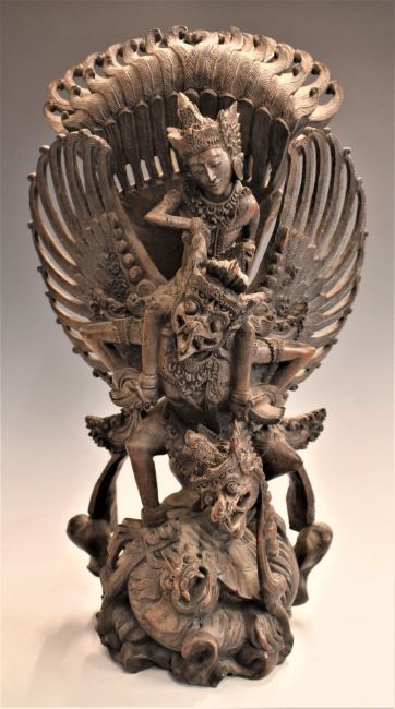 Balinese finely carved figure of the Hindu god Vishnu rinding Garuda, 42cm tall.