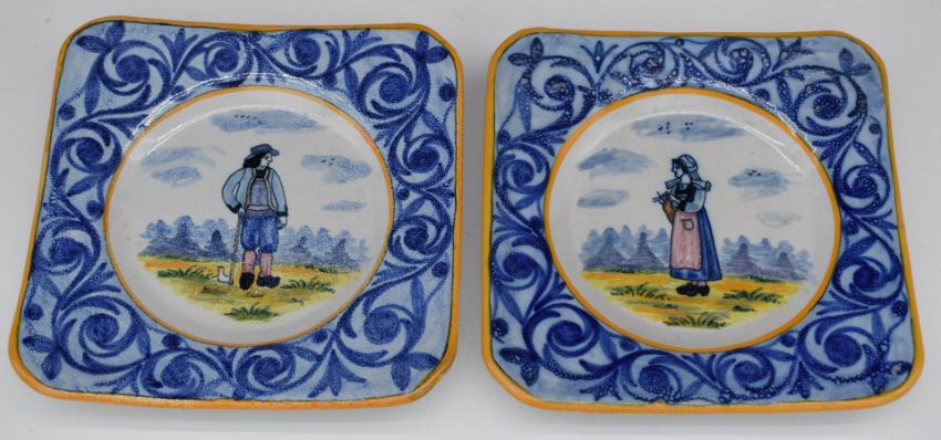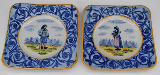A pair of Quimper faience wall plaques with figural decoration and HB monogram verso, 21.5 x 21.5cm