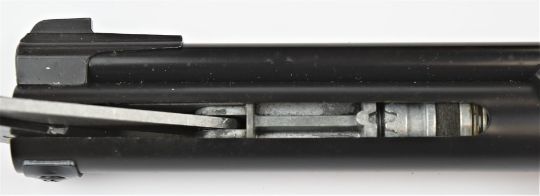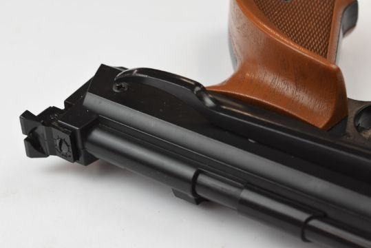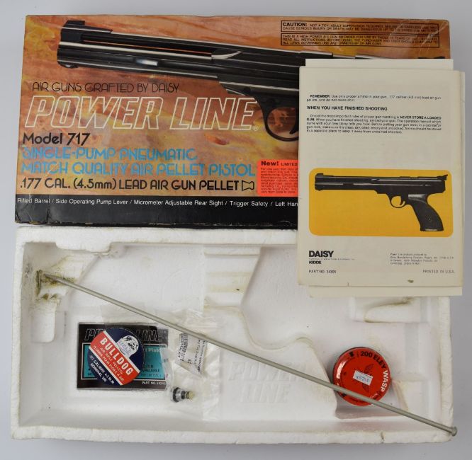 Daisy Power Line Model 717 .177 target air pistol with shaped and chequered grips and adjustable sights, serial number E147536, in original fitted box with related paperwork