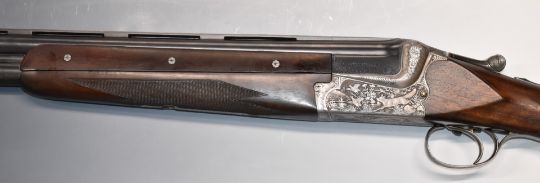 Merkel 201E 12 bore over and under ejector shotgun with engraved scenes of foxes and birds to the locks, engraved top plate, trigger guard, thumb lever, fences and underside, single selective trigger, chequered grip and forend, vented top rib and 28 inch barrels choked ½, overall length 114cm, length of pull 35.5cm, serial number 167905. PLEASE NOTE THAT A VALID RELEVANT FIREARMS/SHOTGUN CERTIFICATE IS REQUIRED TO HANDLE/PURCHASE THIS ITEM.