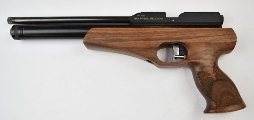 Brocock AimX Grand .22 PCP target air pistol with shaped and chequered grip, adjustable hair trigger and scope rail, serial number 5086, in original box with sound moderator, related paperwork and filling accessories.