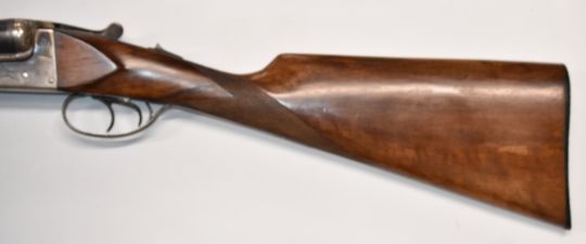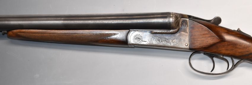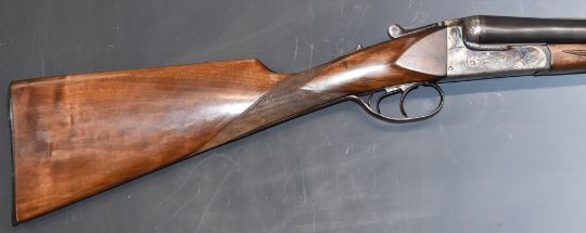 Essex 12 bore side by side shotgun with engraved scenes of dogs to the locks, engraved underside, trigger guard, fences, top plate and gold named thumb lever, chequered grip and forend, double trigger and 28 inch barrels choked full and ½, overall length 113cm, length of pull 35.5cm, serial number YZ7923. PLEASE NOTE THAT A VALID RELEVANT FIREARMS/SHOTGUN CERTIFICATE IS REQUIRED TO HANDLE/PURCHASE THIS ITEM.