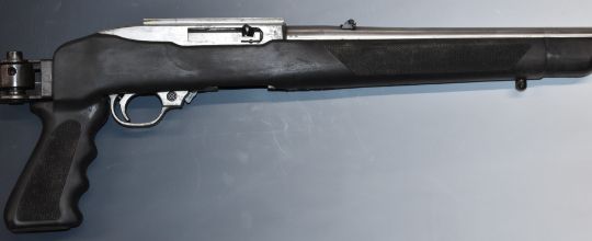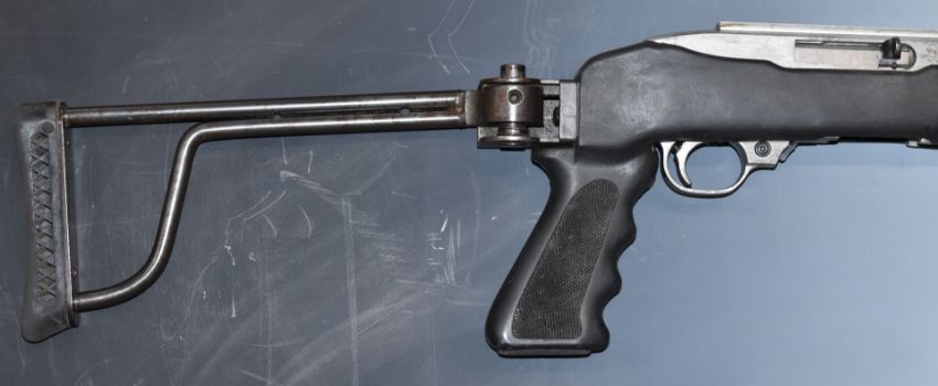 Ruger model 10/22 .22 semi-automatic carbine rifle with chequered pistol grip and forend, folding tactical stock and 19 inch barrel, overall length 93.5cm, serial number 239-86379. PLEASE NOTE THAT A VALID RELEVANT FIREARMS/SHOTGUN CERTIFICATE IS REQUIRED TO HANDLE/PURCHASE THIS ITEM.