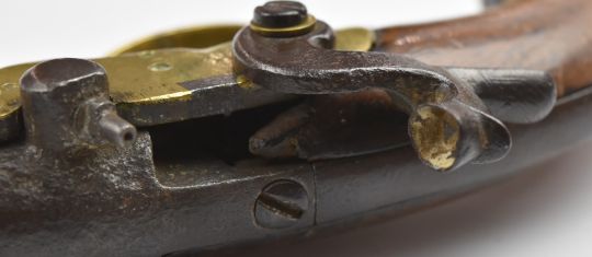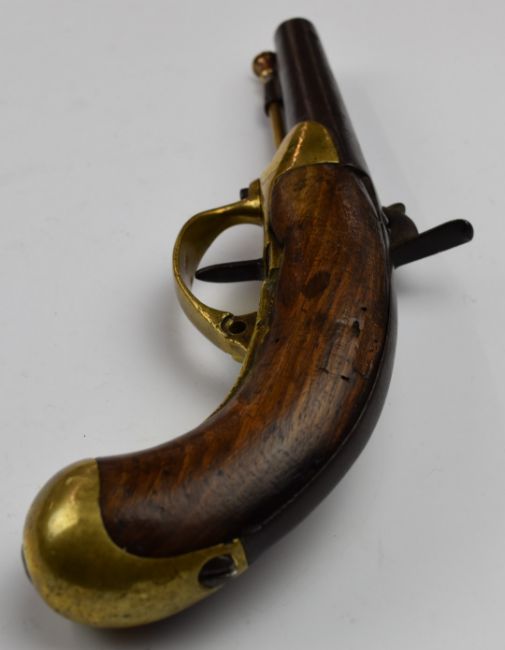 Manbeuge French percussion converted from flintlock hammer action service pistol with named brass lock stamped 'B387T', brass trigger guard and ram-rod, steel hammer and 5.5 inch smooth bored steel barrel, overall length 31.5cm