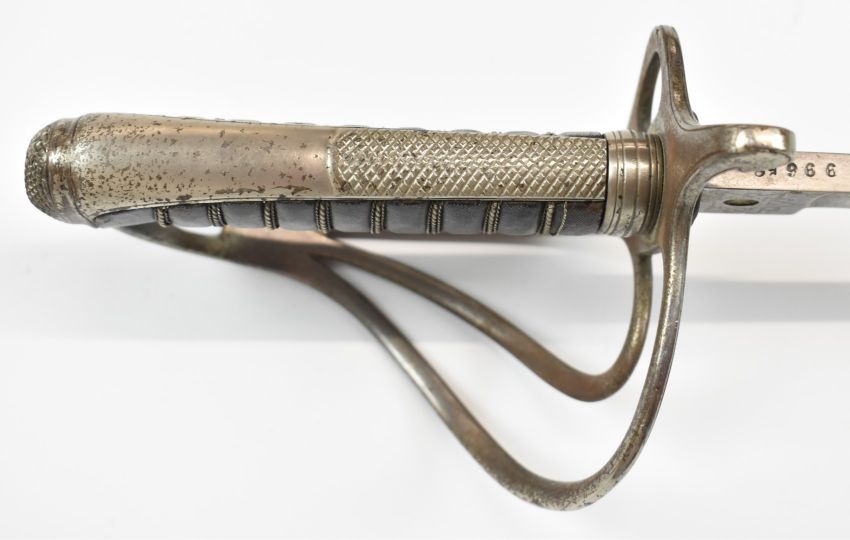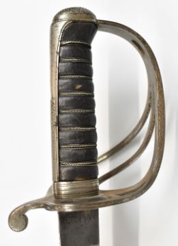 British 1821 pattern Light Cavalry sword with shagreen grip, serial number 99658, Queen's crown cypher to part decorated 91cm blade, maker Nash, Savile Row, London to ricasso and leather covered scabbard. PLEASE NOTE ALL BLADED ITEMS ARE SUBJECT TO OVER 18 CHECK ON COLLECTION OR DELIVERY